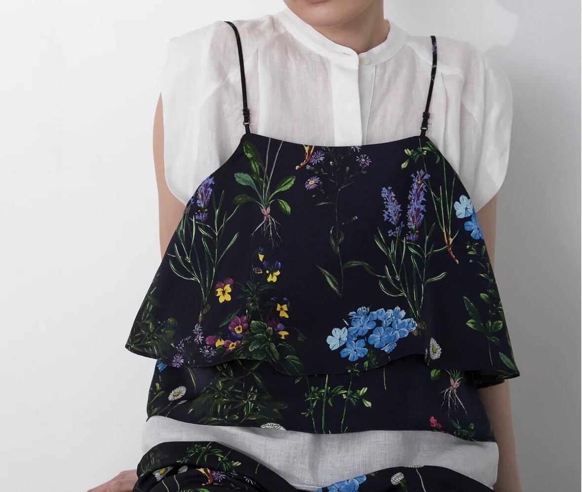 カットソーや T シャツなどお好みのトップスとレイヤードしたりさらっと 1 枚で纏ってもかわいい。同素材で展開しているパンツ とセットでコンビネゾンのように着ていただくのもとても素敵です。夏の装いに花を添えてくれる1枚です。